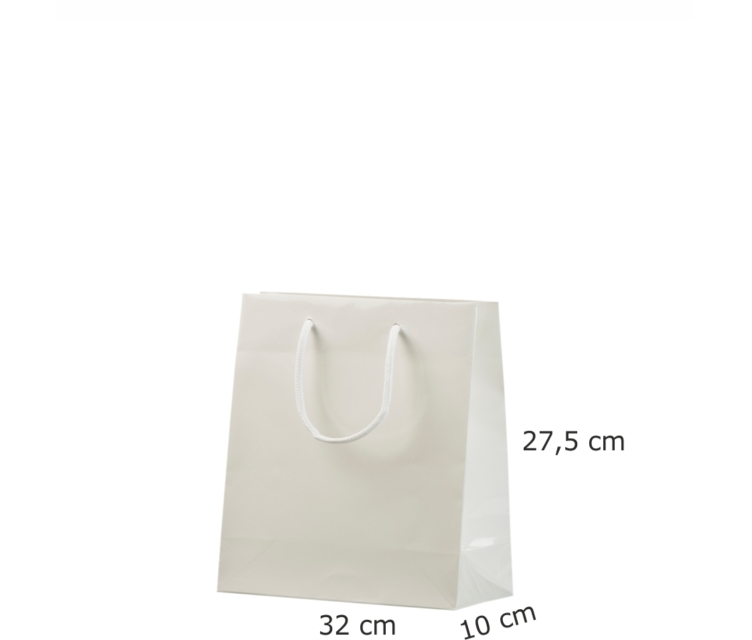 Valikus 9 erineva suurusega valget värvi, läikiva laminaadiga, käsitööna valmistatud paberkotte: