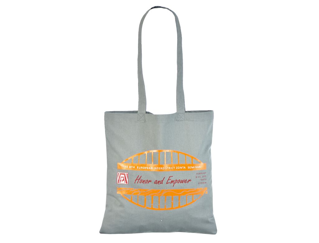 Fotogalerii- halli värvi riidest kott trükiga Halli värvi riidest kott pikkade sangadega.