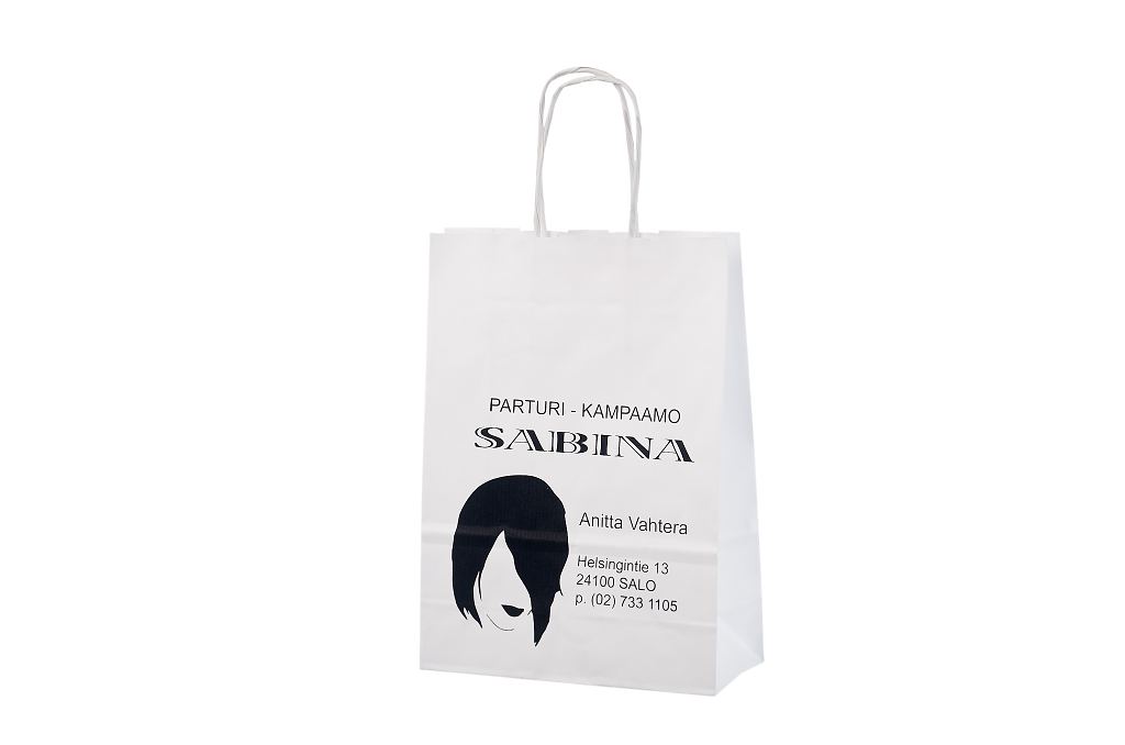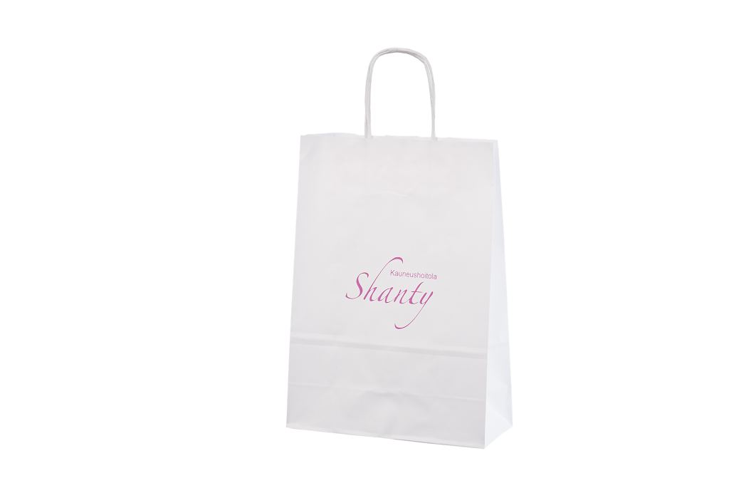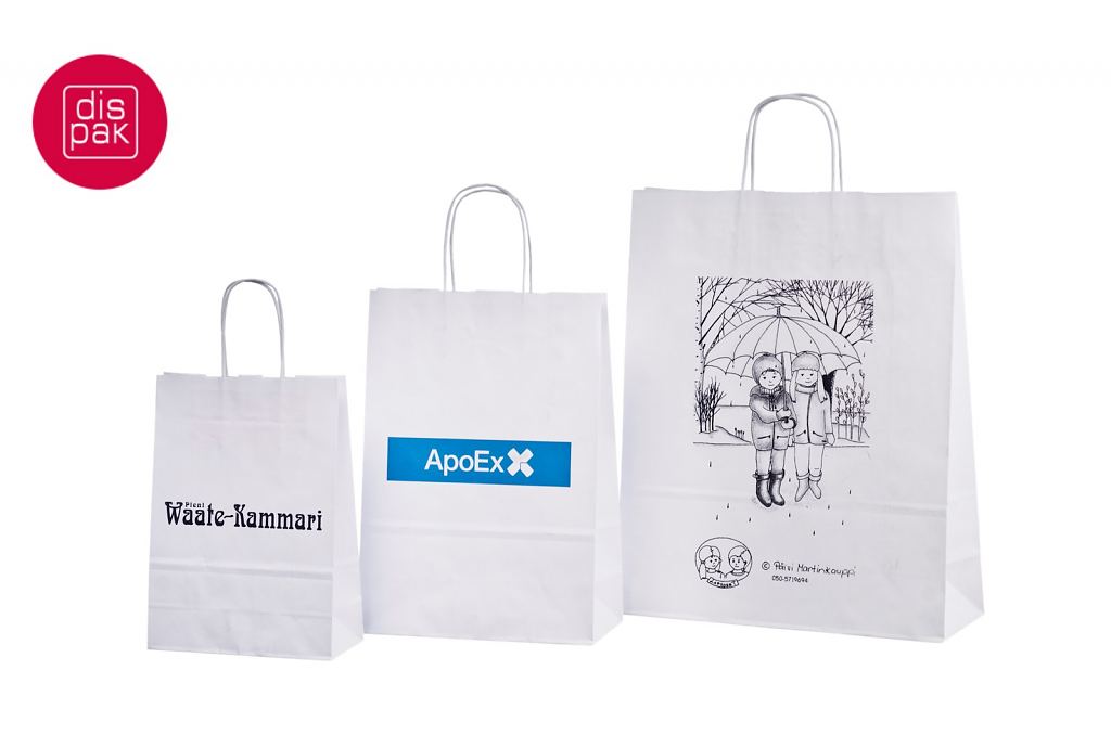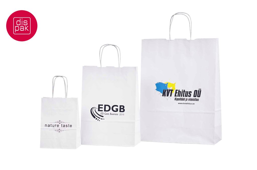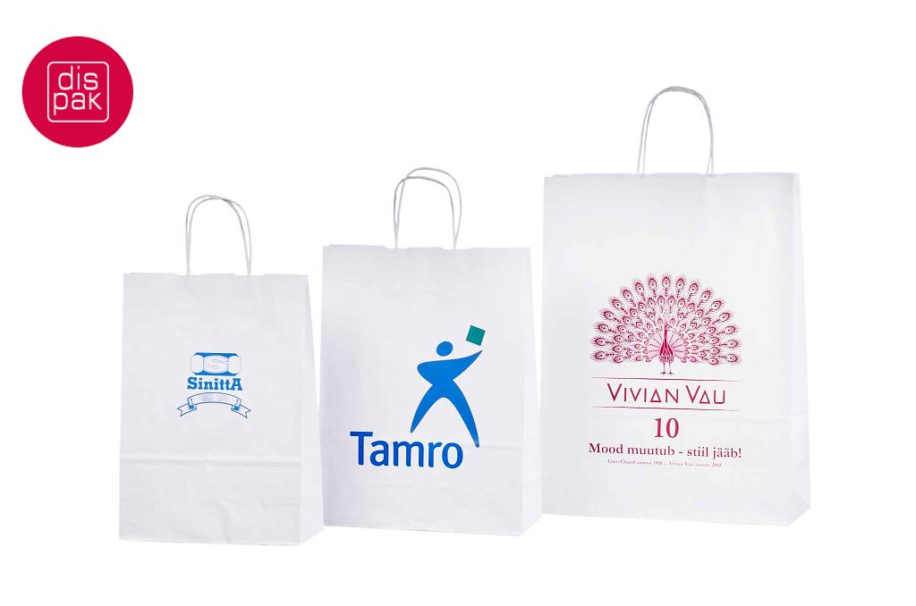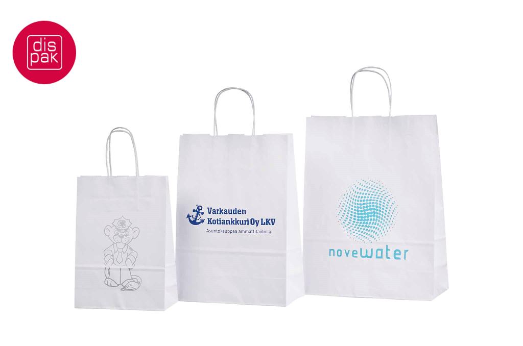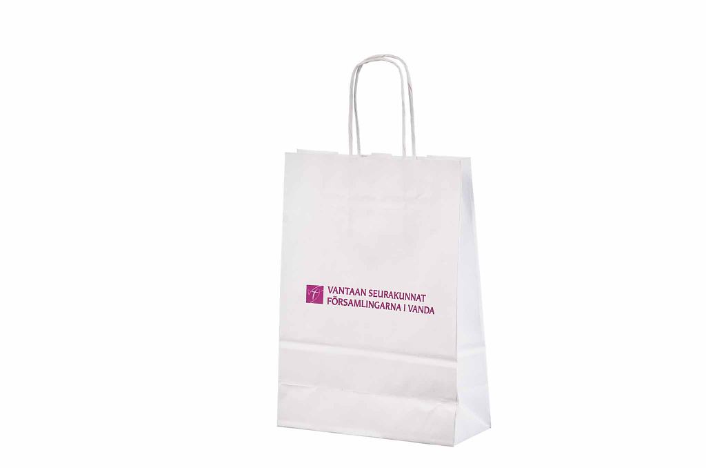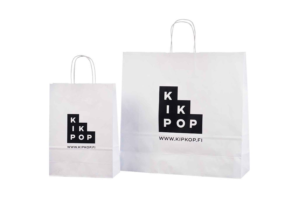 Vahvat ja kestävät valkoiset paperikassit. Kuljetus Suomeen ilman lisämaksua. Voidaan räätälöidä omalla logolla.