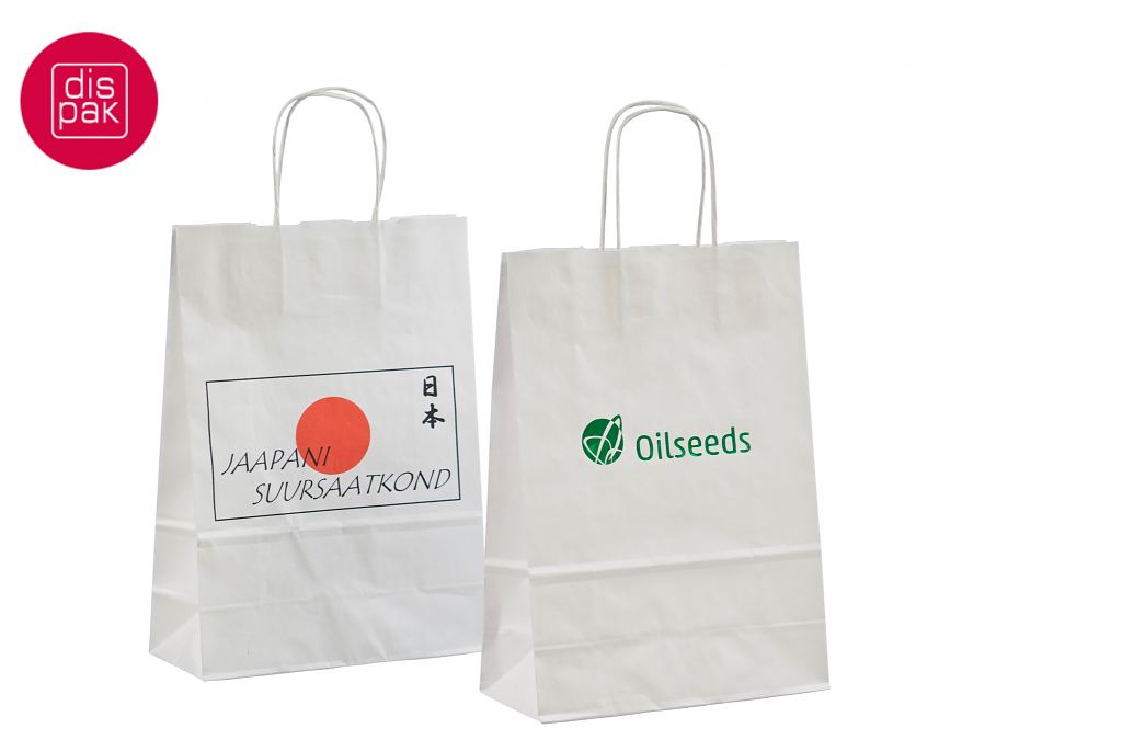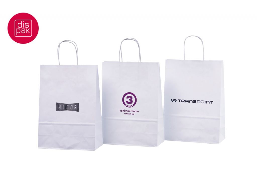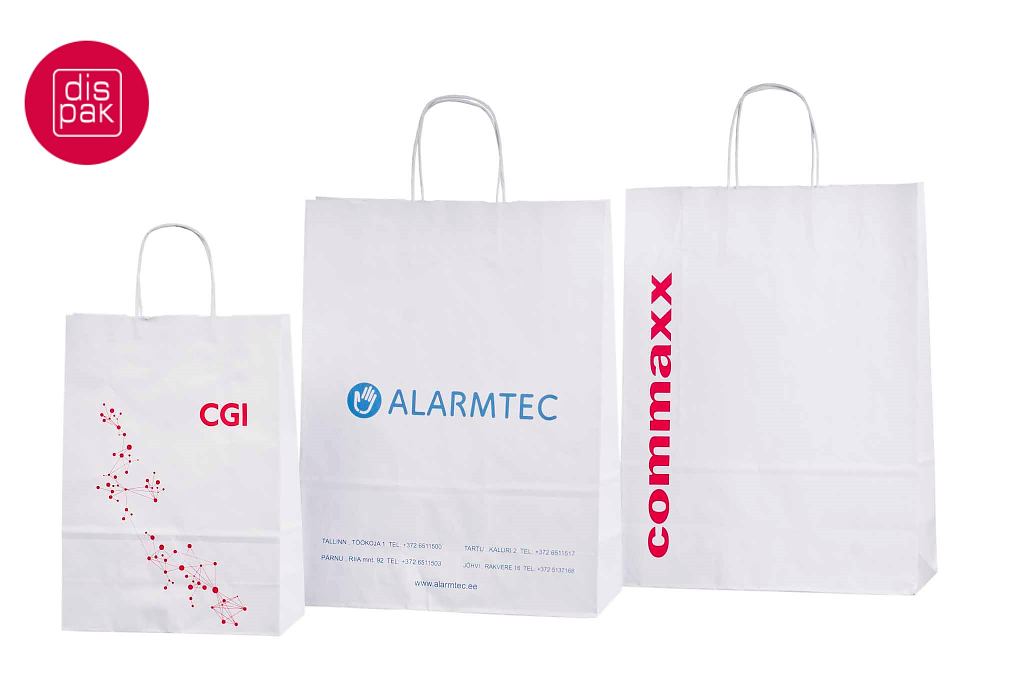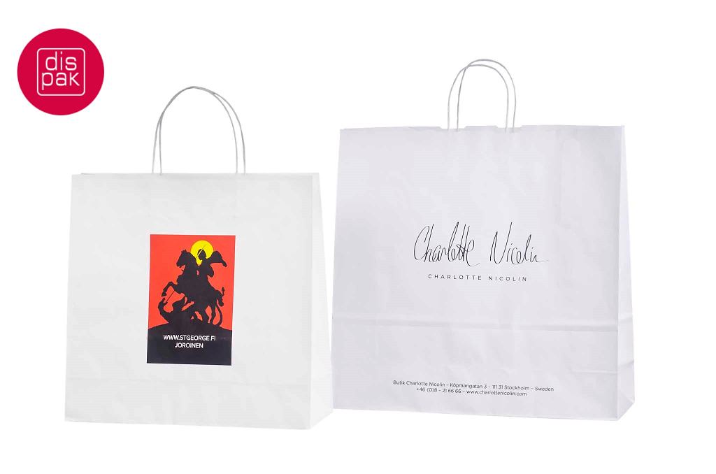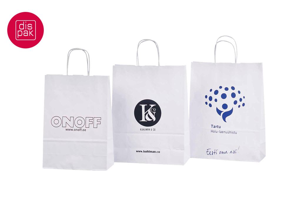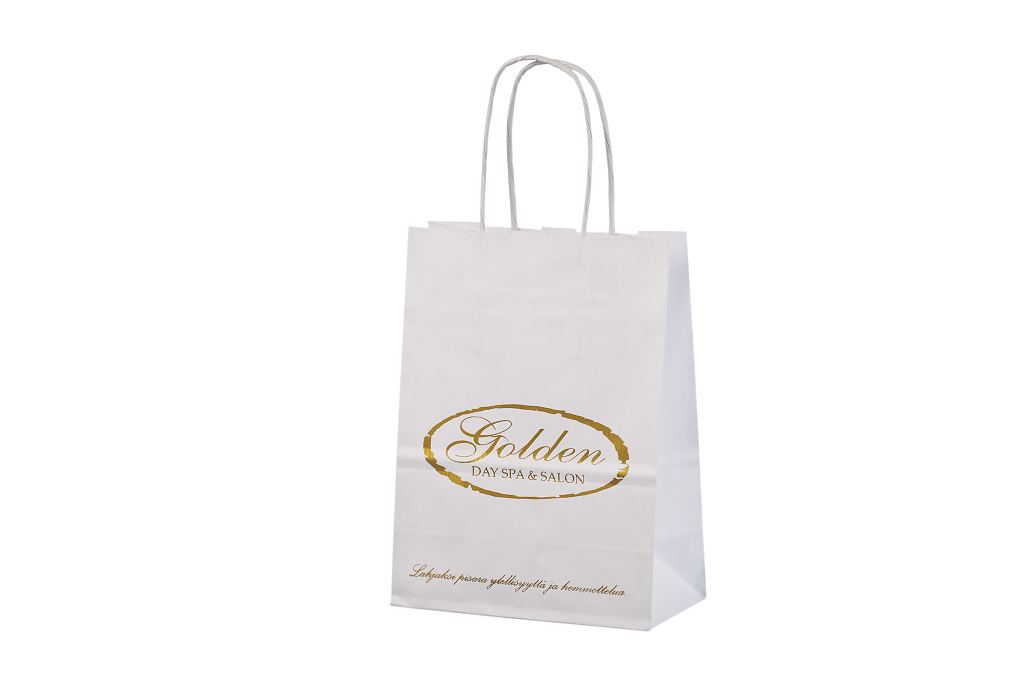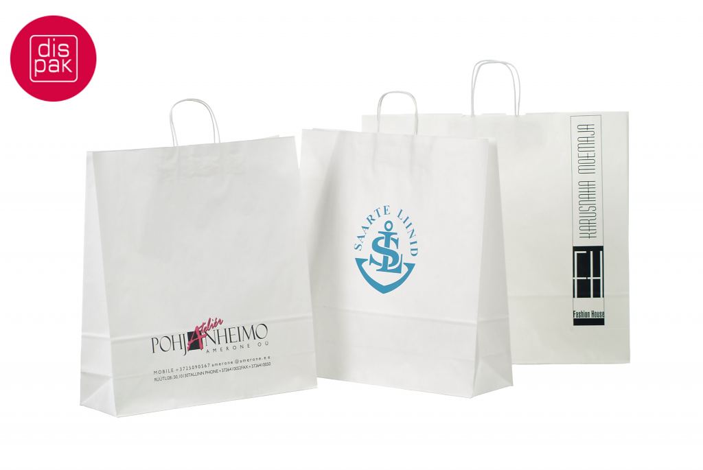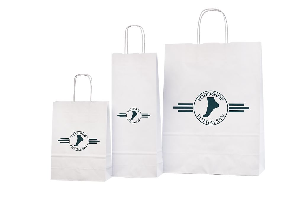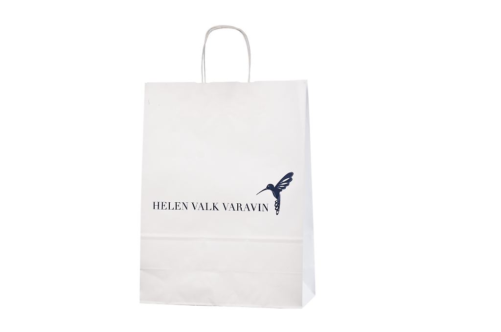 Vahvat ja kestävät valkoiset paperikassit. Kuljetus Suomeen ilman lisämaksua. Voidaan räätälöidä omalla logolla.