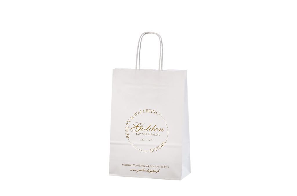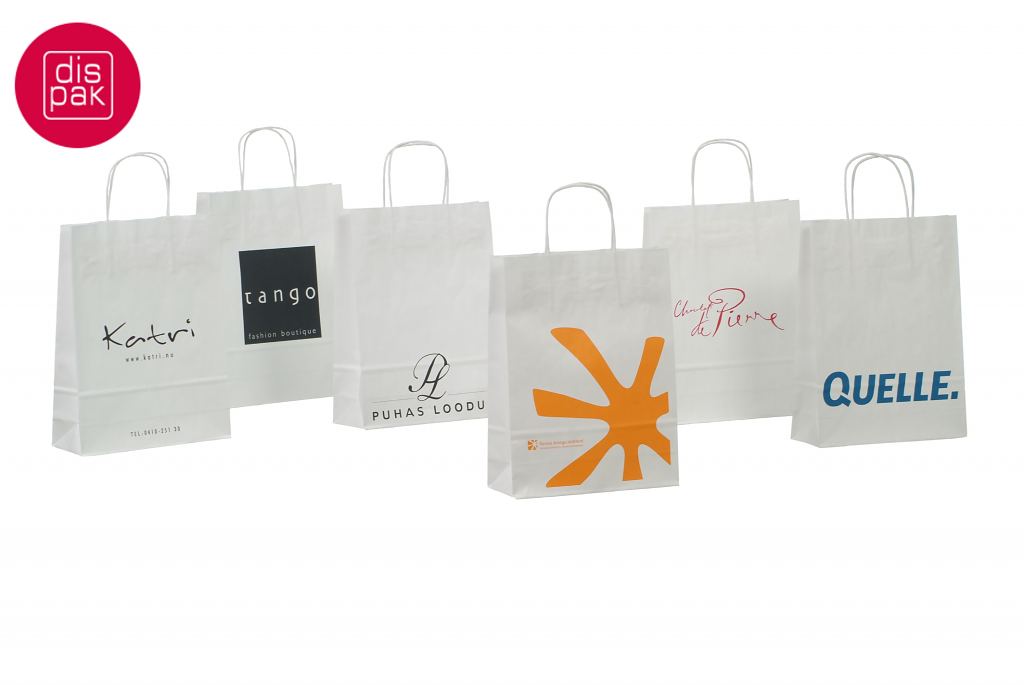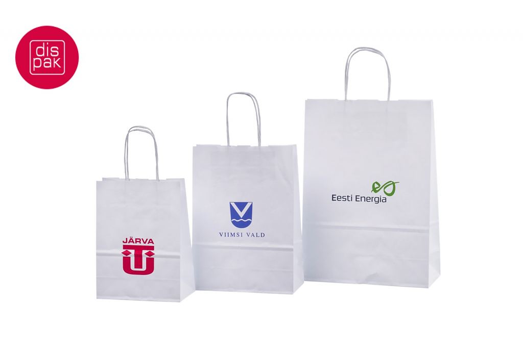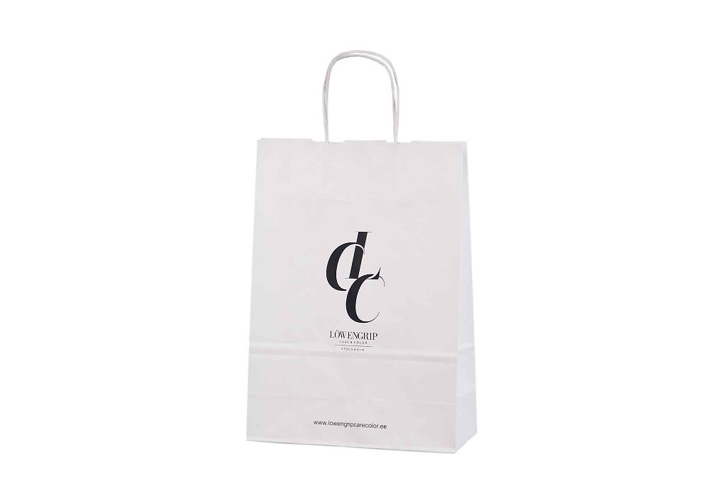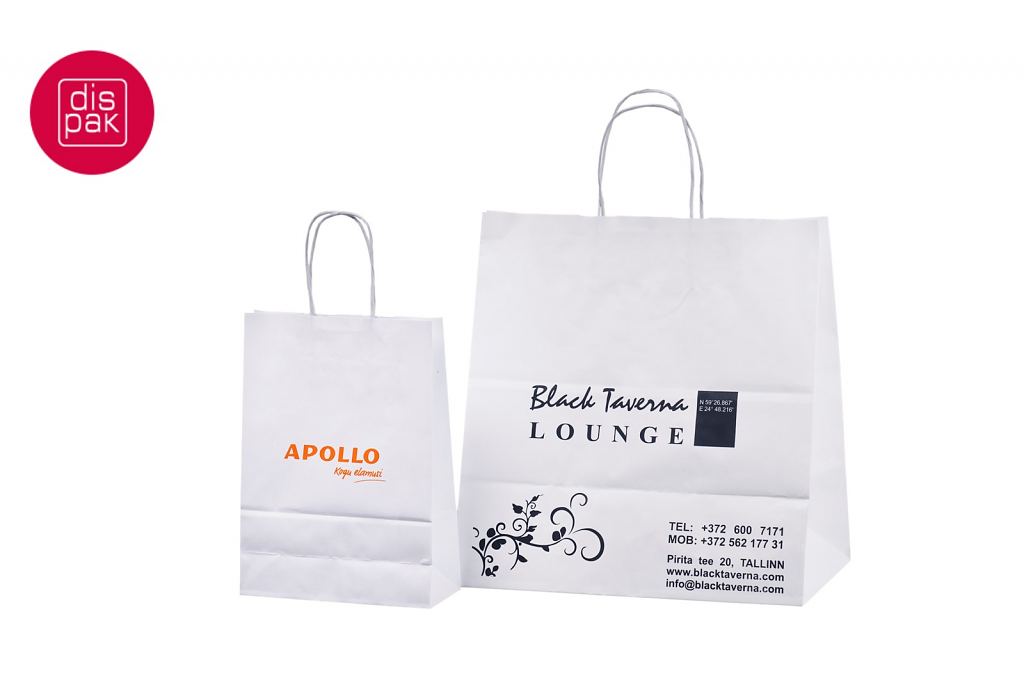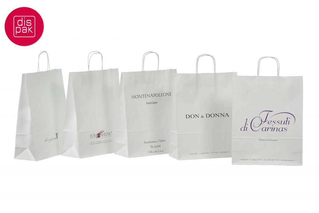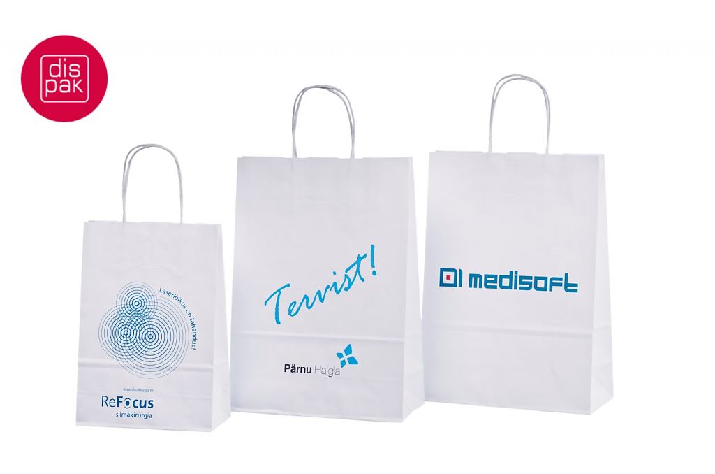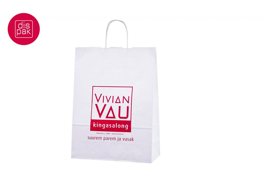 Vahvat ja kestävät valkoiset paperikassit. Kuljetus Suomeen ilman lisämaksua. Voidaan räätälöidä omalla logolla.