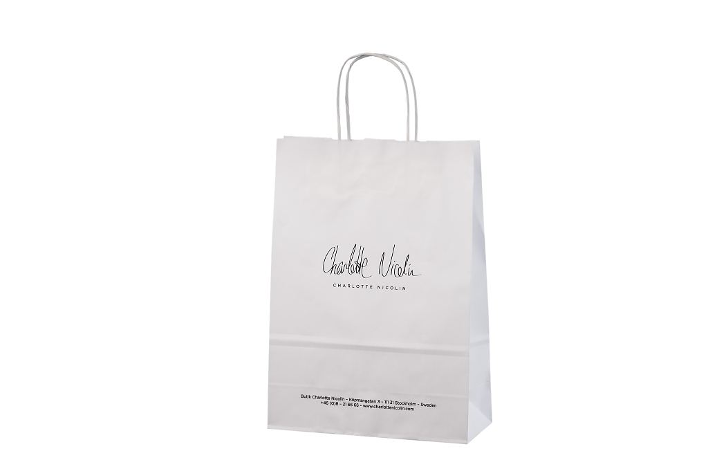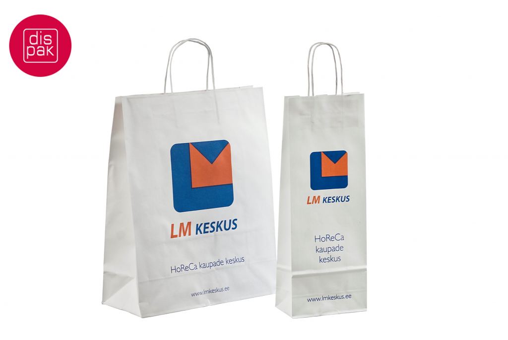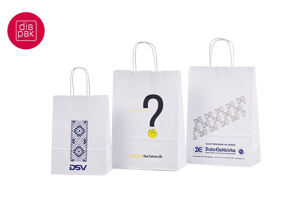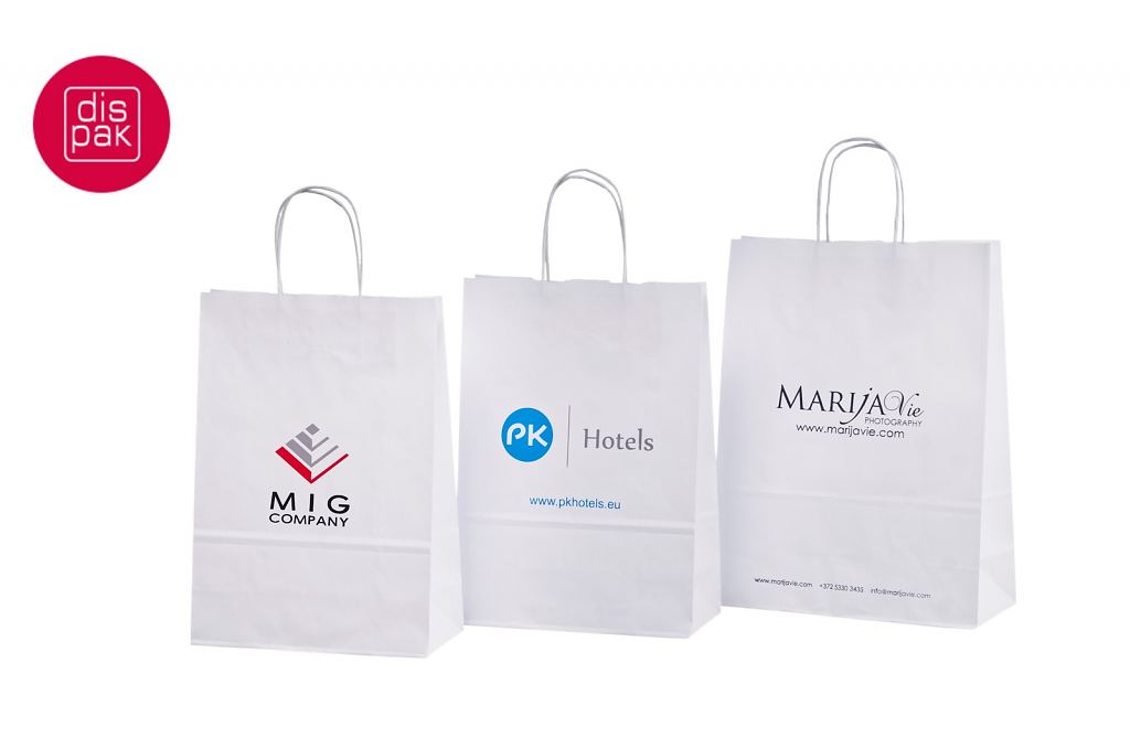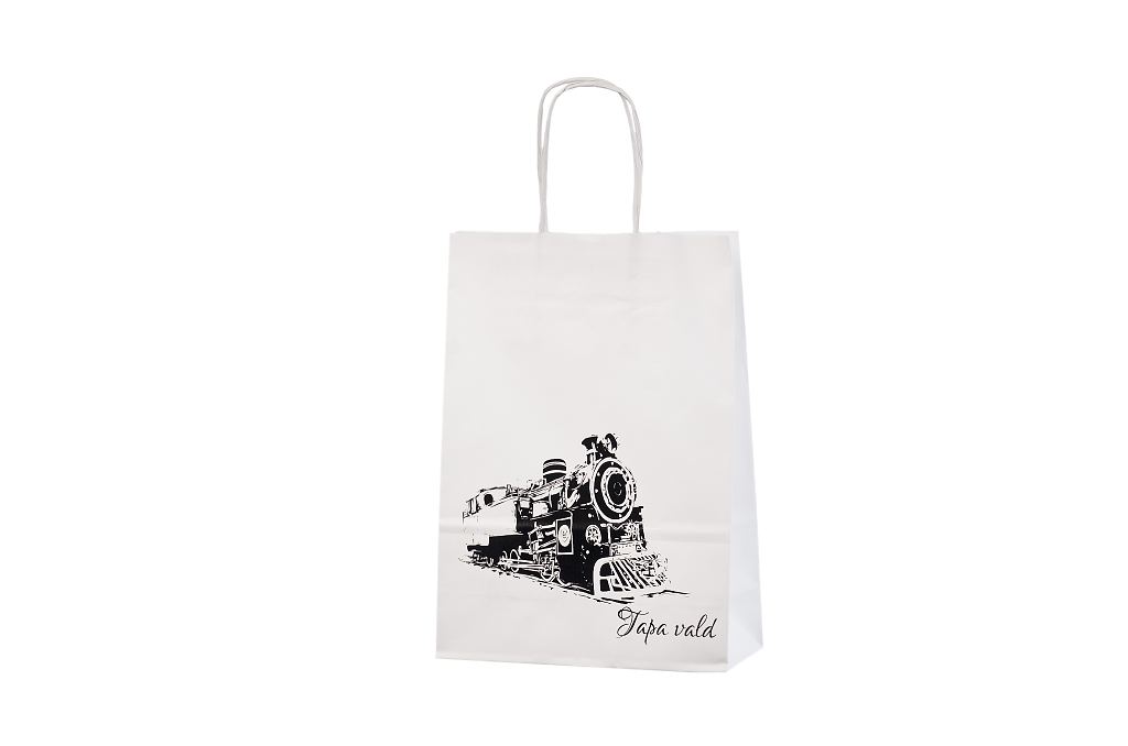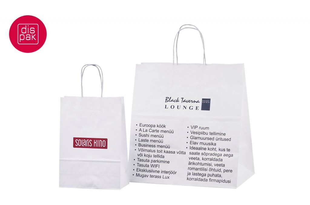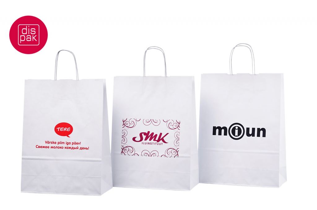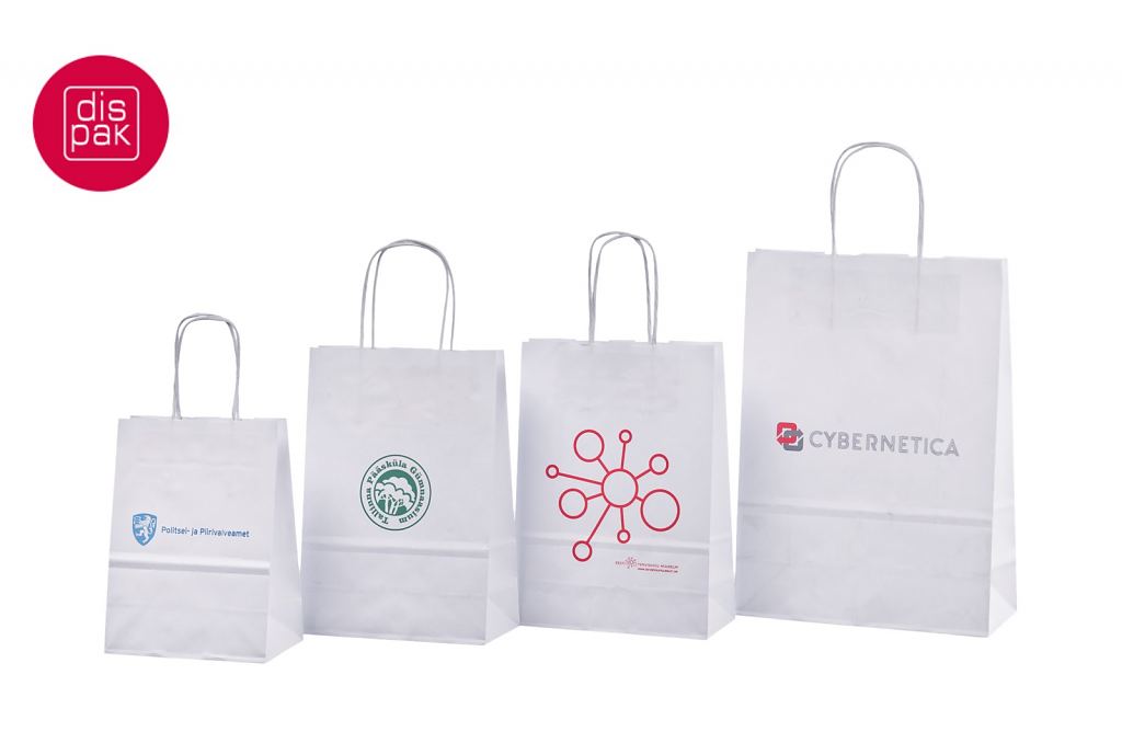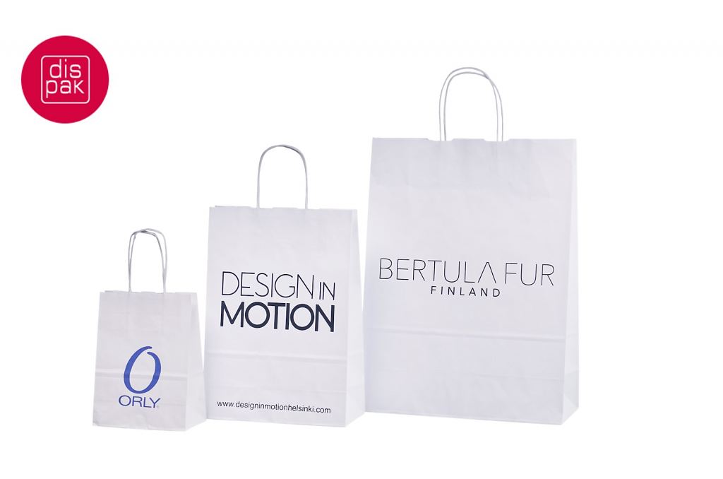 Vahvat ja kestävät valkoiset paperikassit. Kuljetus Suomeen ilman lisämaksua. Voidaan räätälöidä omalla logolla.
