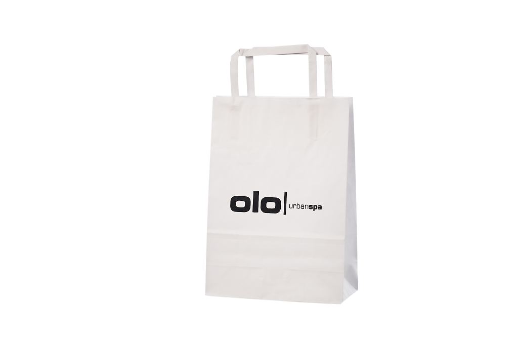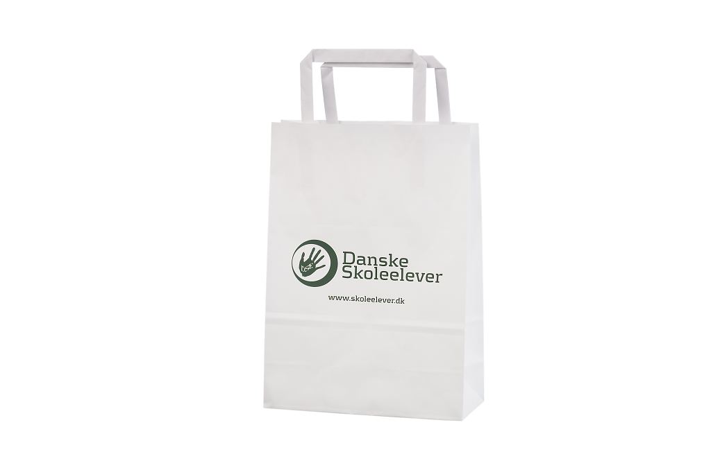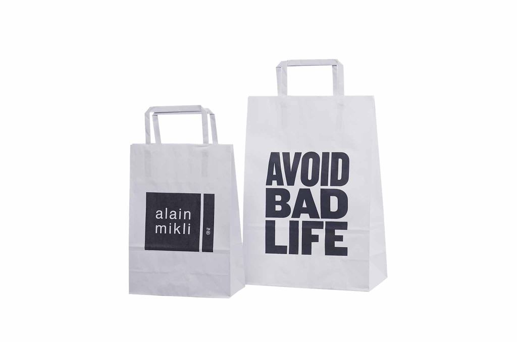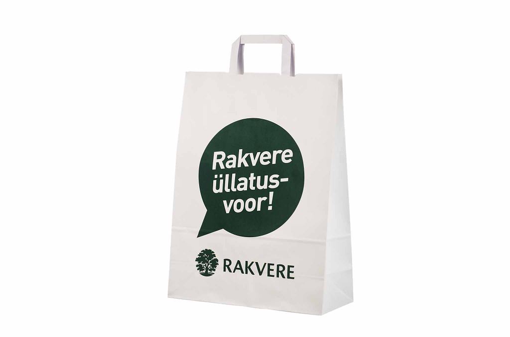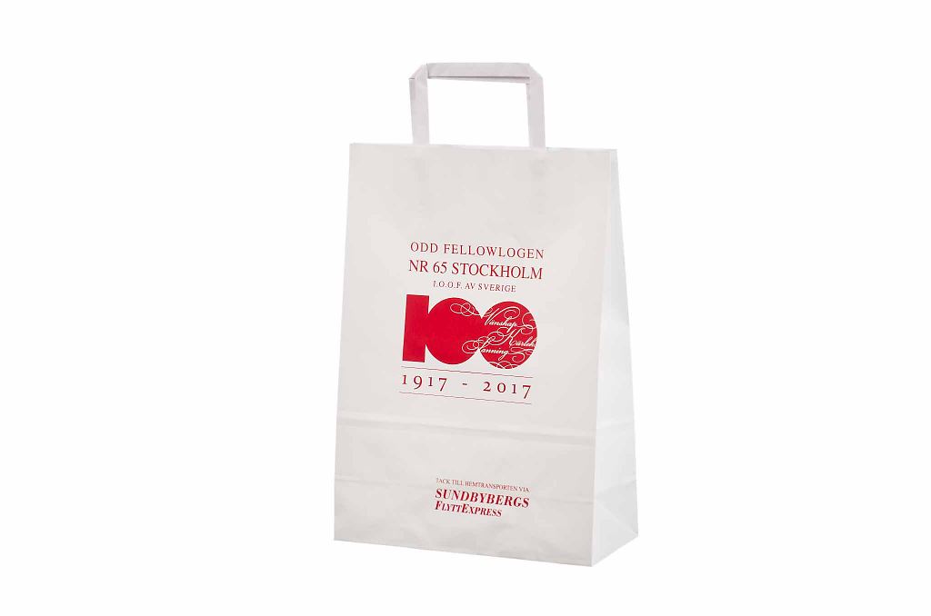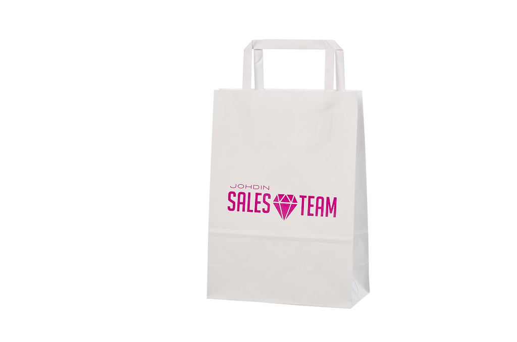 Valkoinen litteäkannikkeinen paperikassi yrityksen logolla. Saatavana useissa eri ko'oissa. Minimi